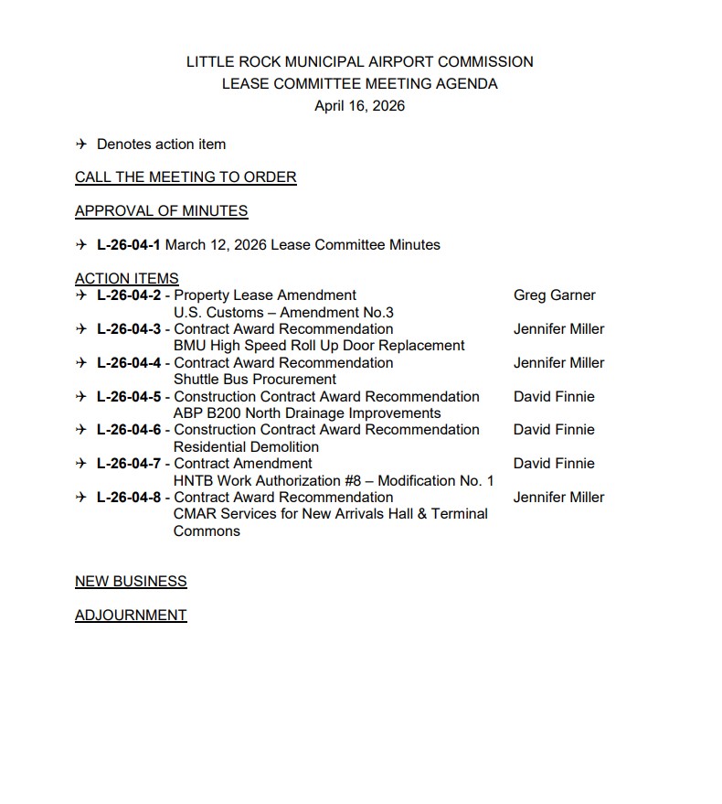 All meetings will be held at the Airport Administrative Offices, Terminal – Second Floor